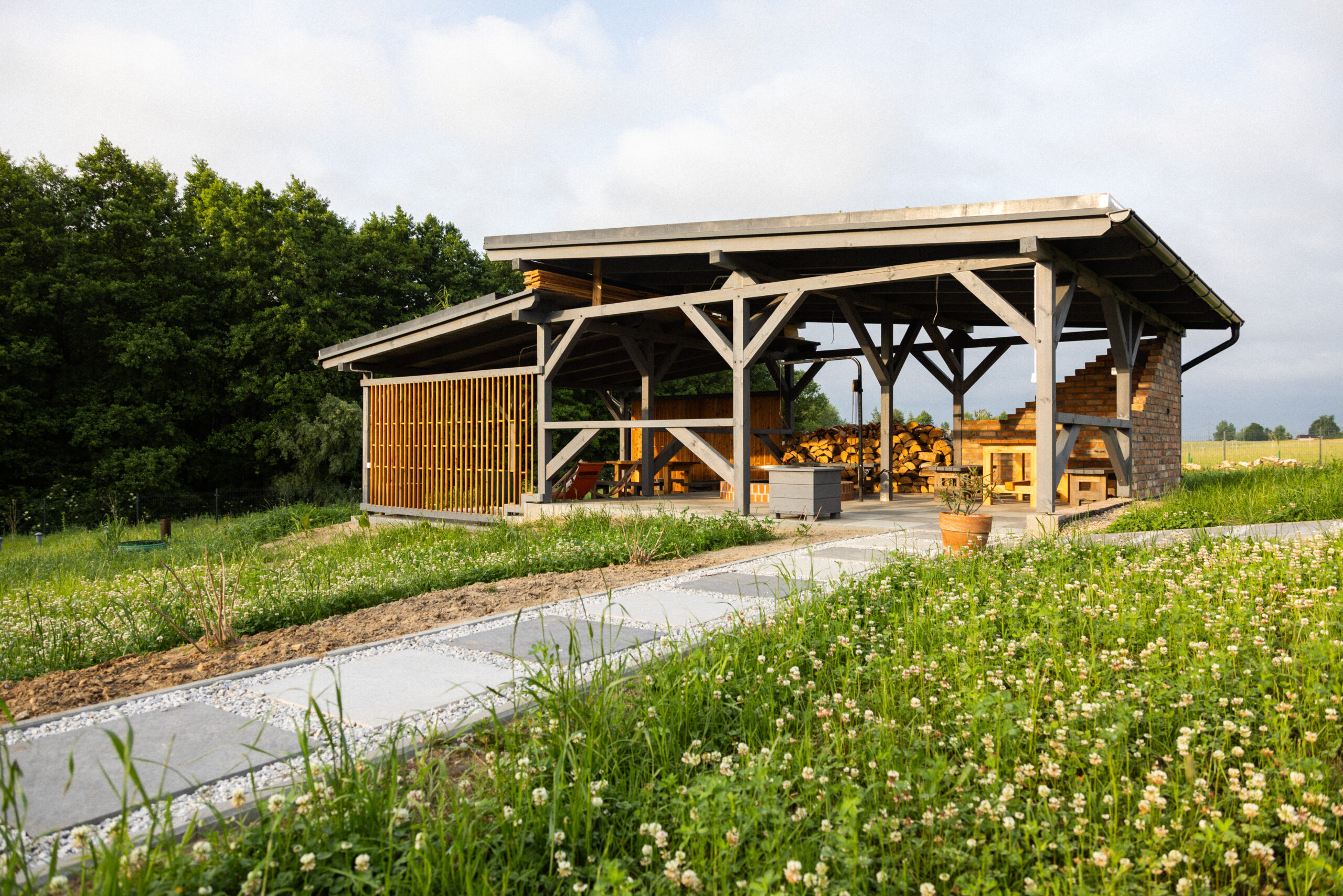 Na ogrodzonym terenie dostępne są miejsca parkingowe, a także palenisko na ognisko z grillem i ławami. W trakcie budowy jest plac zabaw dla dzieci, który wkrótce będzie gotowy do użytku. Co więcej, jesteśmy miejscem przyjaznym dla zwierząt – możesz zabrać ze sobą swojego pupila, aby cieszyć się wspólnym wypoczynkiem.